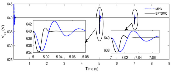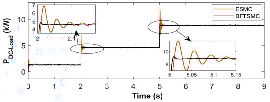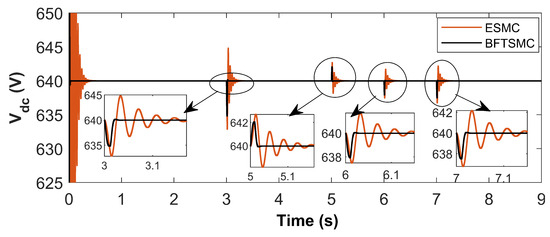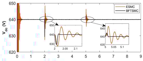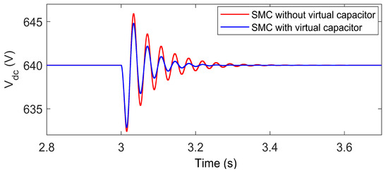 To overcome these limitations, virtual capacitance is introduced as an effective alternative. By emulating the behavior of a physical capacitor through control algorithms and converter dynamics, virtual capacitance enhances transient response and voltage stability without the drawbacks associated with bulky hardware. This approach is particularly advantageous in HADCMGs, where space, response time, and adaptability are critical considerations. The impact of virtual capacitance becomes especially evident when integrated with existing SMC strategies. As demonstrated in Figure 5, a comparative analysis shows that an SMC integrated with virtual capacitance yields superior performance compared to one without it—especially during transients and load variations. The SMC with virtual capacitance achieves a settling time of 220 ms and an overshoot of 0.78%, compared to 400 ms and 1.09% for the standard SMC. Furthermore, the voltage nadir improves from 631 V to 632 V with the integration of virtual capacitance. These results indicate enhanced voltage regulation and faster dynamic response, establishing virtual capacitance as an indispensable feature for stabilizing low-inertia HADCMGs.