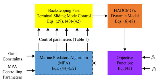 - The adaptive gain tuning of BFTSMC via the marine predators algorithm (MPA): A metaheuristic optimization strategy based on the MPA is employed for the online tuning of control parameters. This adaptive mechanism enhances system robustness and responsiveness to fluctuating PV generation and dynamic loads.
