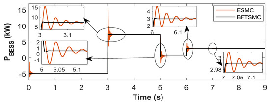 The BESS provides essential support during load transients, demand–supply imbalance, and renewable variability. Ensuring its reliable dynamic modeling is critical for effective SoC control and voltage stabilization. Virtual capacitance improves the converter’s responsiveness and damping characteristics, especially during fast charging/discharging cycles (see Figure 4). The BESS dynamics, enhanced with virtual capacitance and disturbance terms, are represented as