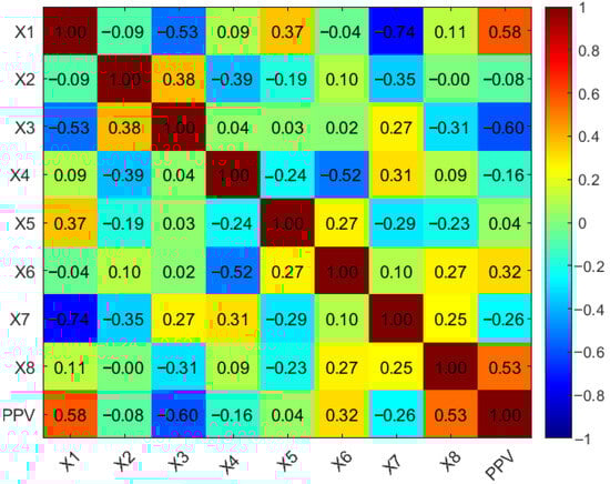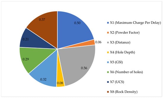Moreover, a correlation matrix was conducted to determine the strength and direction of linear relations among the input parameters and the PPV, as illustrated in Figure 1. The maximum charge per delay (X1) and rock density (X8) showed moderate positive relationships with PPV, whereas distance from the blasting face to the monitoring face (X3) showed a severe negative association. In addition, with regard to the hole depth (X4), powder factor (X2), and other variables such as UCS (X7) showed weak to moderate relationships.