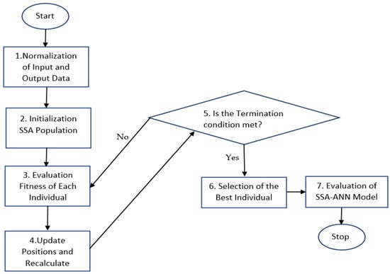 The SSA-ANN hybrid model integrates the global optimization capability of the SSA with the predictive versatility of an ANN to improve performance in modeling complex nonlinear variables. This combination of methods leverages SSA to optimize the initial weights and biases of the ANN before training; this removes reliance on gradient-based learning techniques such as backpropagation, which tend to be impacted by initial conditions and are vulnerable to premature convergence. The optimization methodology for SSA-ANN is as follows.