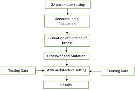 GA-ANNs are used by many researchers to help solve complex nonlinear functions, which present a significant challenge to ANNs. Moreover, GA-ANNs aid in optimization problems as they can conduct global searches, thus reducing the likelihood of convergence to local minima. Furthermore, the GA-ANN hybrid model makes use of GA search method to determine the ideal weights and biases for the ANN, which ultimately results in an improvement in the ANN’s ability to predict outcomes. Figure 4 shows the general structure of the GA-ANN model. ANN is optimized using GA as follows: