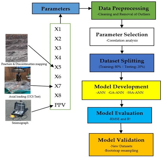 The paper is structured as follows. Section 2 describes the materials and methods, including the data acquisition, correlation matrix, and description of each methodology employed. Section 3 presents the proposed SSA-ANN model, the GA-ANN model, the ANN model, and the USBM predictor methodology. Section 4 reports the results and discusses their implications. Finally, Section 5 offers the conclusions.