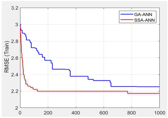 Figure 6 illustrates the convergence rate for both SSA-ANN and GA-ANN. The SSA-ANN efficiently lowered RMSE and achieved stability much more quickly than GA-ANN. The SSA’s flexibility in the exploration-exploitation process enabled effective convergence to optimal weights, resulting in enhanced model predictive performance. The basic ANN models generated demonstrated R2 values that ranged from 0.400 to 0.594, while the GA-ANN models reported a range of 0.614–0.712.