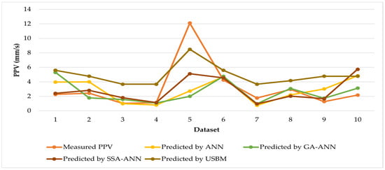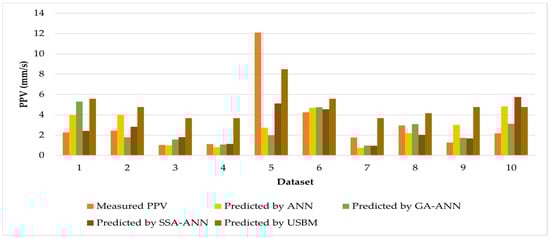 Further validation was carried out to test the ability to generalize the developed models by applying ten new blasting datasets that were entirely independent from both the training and testing processes. The datasets were used to evaluate the optimal configurations of the ANN, GA-ANN, and SSA-ANN models, together with the empirical USBM equation, to assess the accuracy of their predictions on new data. Figure 7 and Figure 8 demonstrates that the SSA-ANN model closely approached the measured PPV values in almost all instances, showing minimal variations across the validation datasets. Moreover, the ANN and GA-ANN models demonstrated a fair-to-satisfactory performance; however, both were sometimes under- or overestimated the PPV values, especially in datasets 5 and 10. In addition, the GA-ANN shows significant improvements compared to the standard ANN, correlating with prior findings from the testing phase.