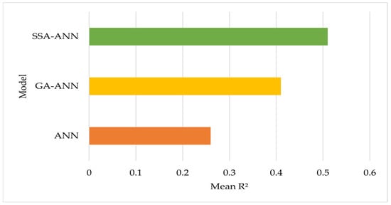 In addition, bootstrap resampling was conducted to further improve the validation of the prediction performance of the SSA-ANN, GA-ANN, and standard ANN models. SSA-ANN obtained the highest mean R2 score of 0.51, demonstrating improved consistency and reliability in predicting PPV as shown in Figure 9. GA-ANN achieved a mean R2 of 0.41; the ANN model generated a lower mean R2 of 0.26.