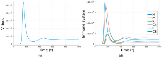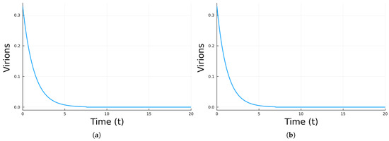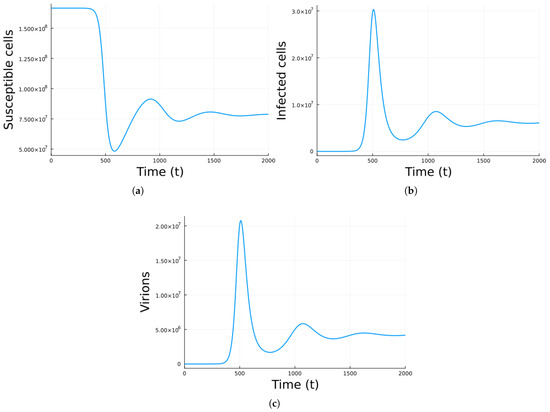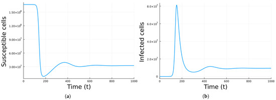 Figure 1 shows the simulation using Model 1 with the parameter values in Table 1. The values correspond to , so there is a chronic equilibrium. As can be observed, the number of infected cells and virions increases at first and then decays to a chronic steady value. That is, the viral infection is not cleared and instead remains persistent. Examples of virus infections that can be chronic are hepatitis B and C and HIV [53].