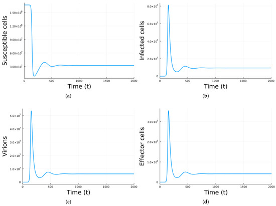 Figure 2 shows a numerical simulation using Model 2, with the parameter values in Table 2. The parameter values correspond to , so there is a chronic equilibrium. Initially, the number of infected cells, virions, and effector cells increases and then decays to the equilibrium state.