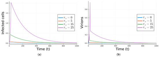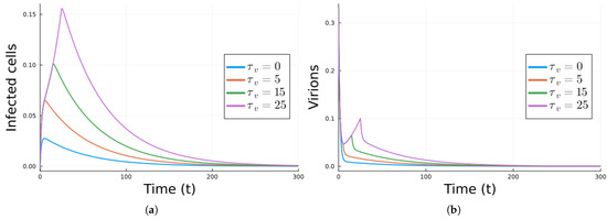 Next, we did simulations where we added antivirals. The equations for Model 1 with antivirals are Equation (4). The values of the parameters that model the antivirals are . With these values, the infection free equilibrium is stable (). To illustrate the effect of the delay in administering the antivirals, simulations were performed with delays of and 25 days. Only the results for the infected cells and virions are shown in Figure 4. As expected, the sooner the antivirals are taken, the faster the infection dies.