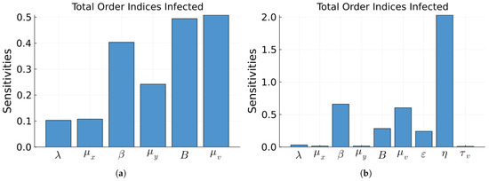 Sobol total order indices for the infected population of Model 1. (a) Without treatment. (b) With treatment. There is bar for each parameter of the model. The ranges of the parameters are the values from Table 1 +/− 20%.