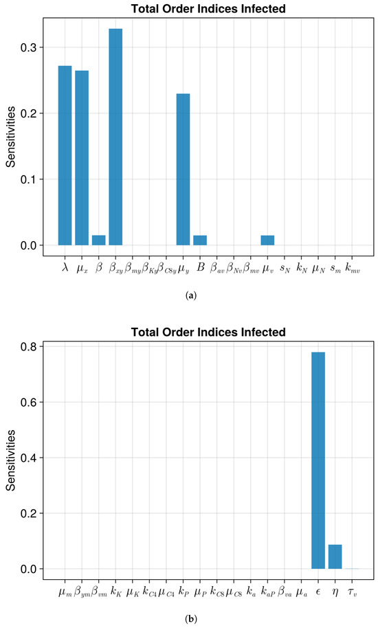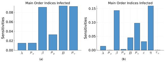 Sobol main order indices for the infected population of Model 1. (a) Without treatment. (b) With treatment. The bars correspond to each of the parameters of the model. The ranges of the parameters are the values from Table 1 +/− 20%.