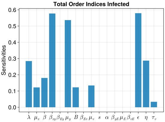 For Model 2, the Sobol total order indices of the infected cells with antivirals are shown in Figure 9. Only the results with treatment are shown. The most important indices are , and . The most influential main order Sobol indices are the same, and since we are most interested in the variations including the interactions, the plot of the main order indices is not included.