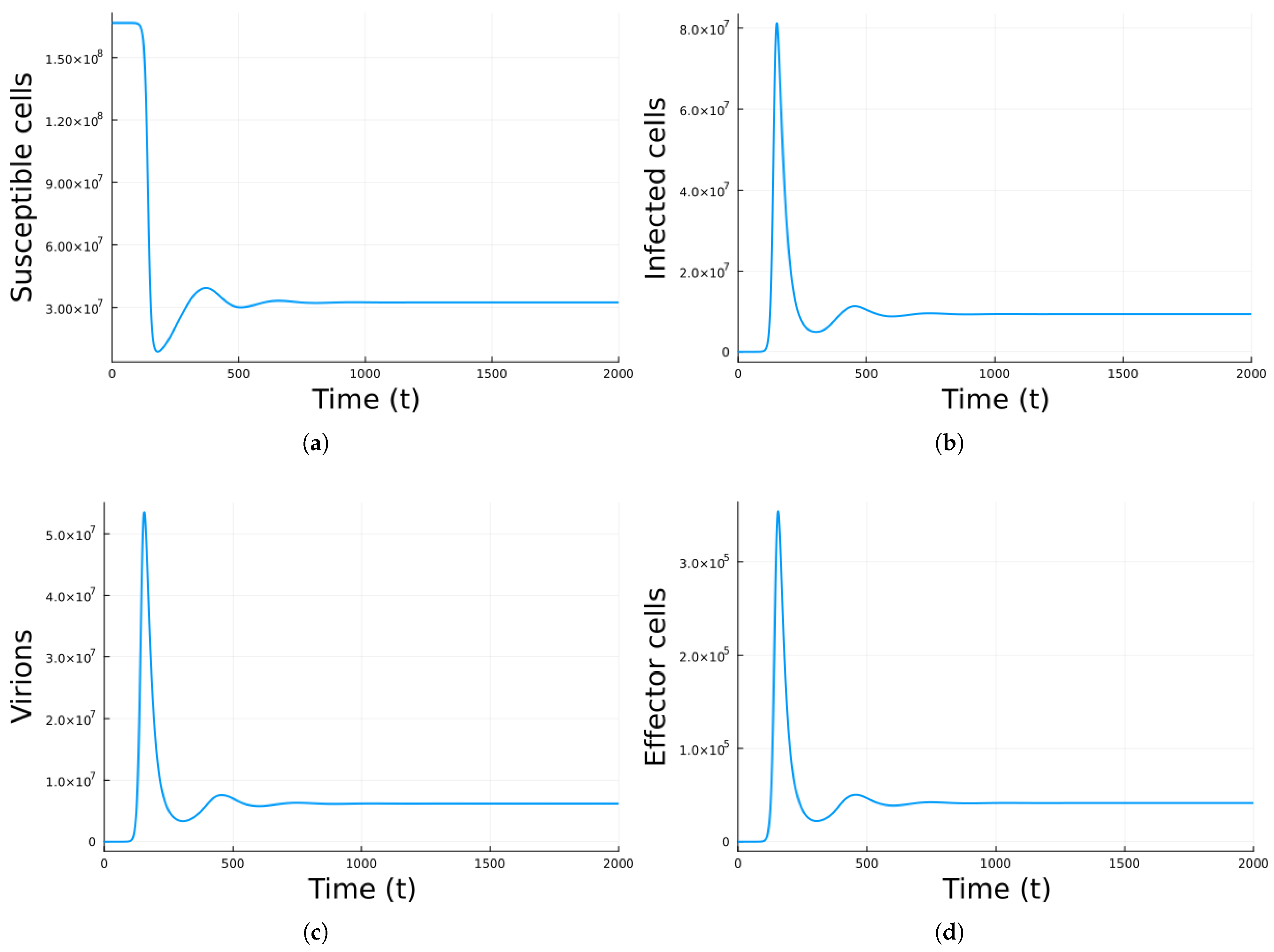 Figure 2 shows a numerical simulation using Model 2, with the parameter values in Table 2. The parameter values correspond to R 0 > 1 , so there is a chronic equilibrium. Initially, the number of infected cells, virions, and effector cells increases and then decays to the equilibrium state.