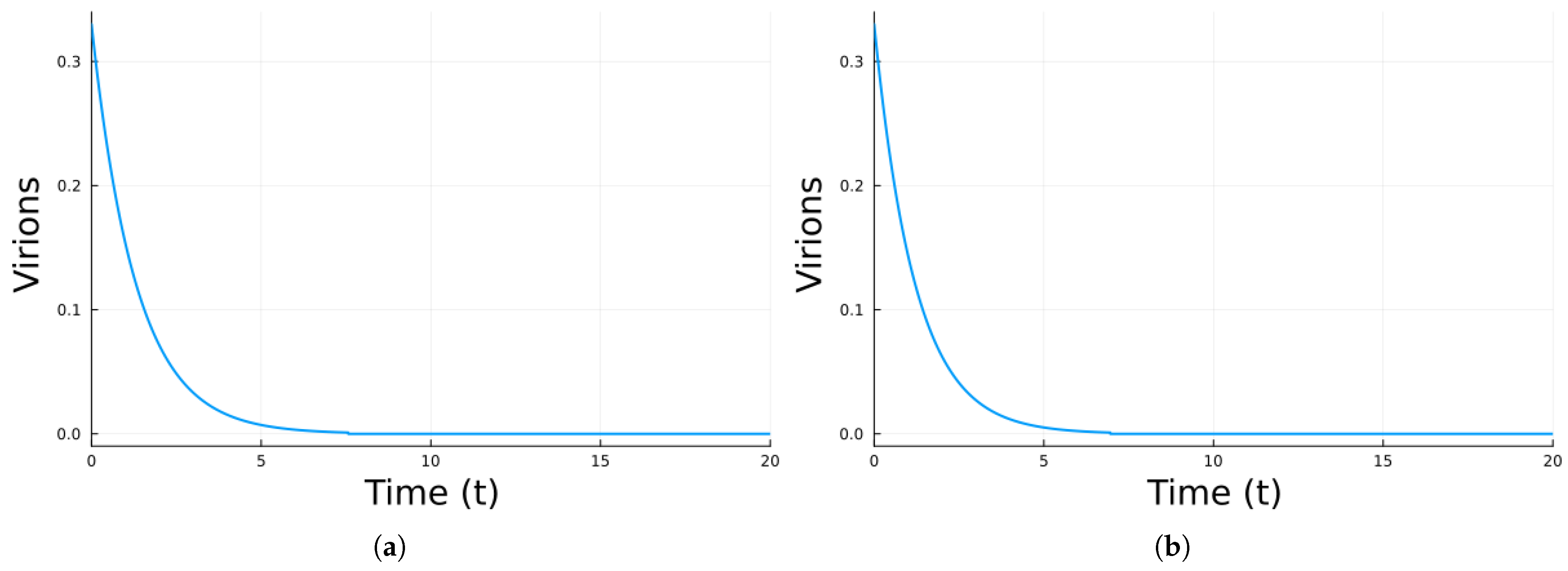 Figure 1 shows the simulation using Model 1 with the parameter values in Table 1. The values correspond to R 0 > 1 , so there is a chronic equilibrium. As can be observed, the number of infected cells and virions increases at first and then decays to a chronic steady value. That is, the viral infection is not cleared and instead remains persistent. Examples of virus infections that can be chronic are hepatitis B and C and HIV [53].