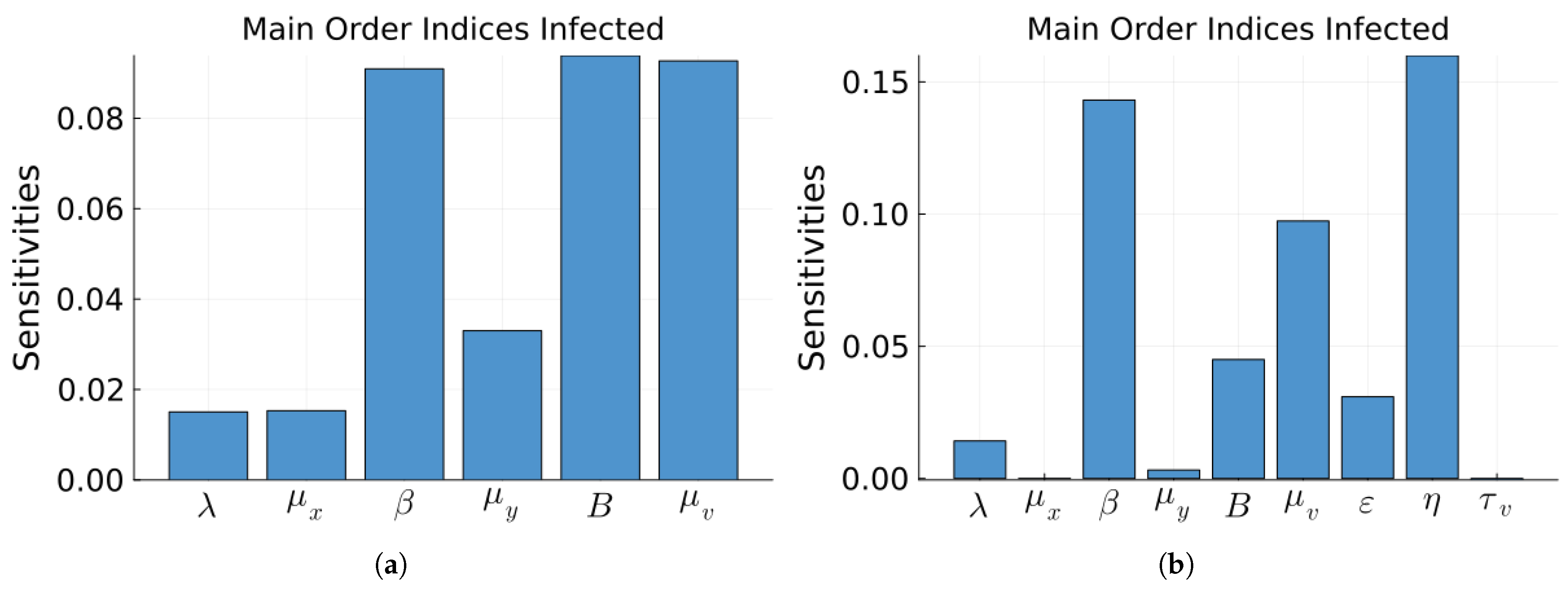 Figure 8. Sobol main order indices for the infected population of Model 1. (a) Without treatment. (b) With treatment. The bars correspond to each of the parameters of the model. The ranges of the parameters are the values from Table 1 +/− 20%.