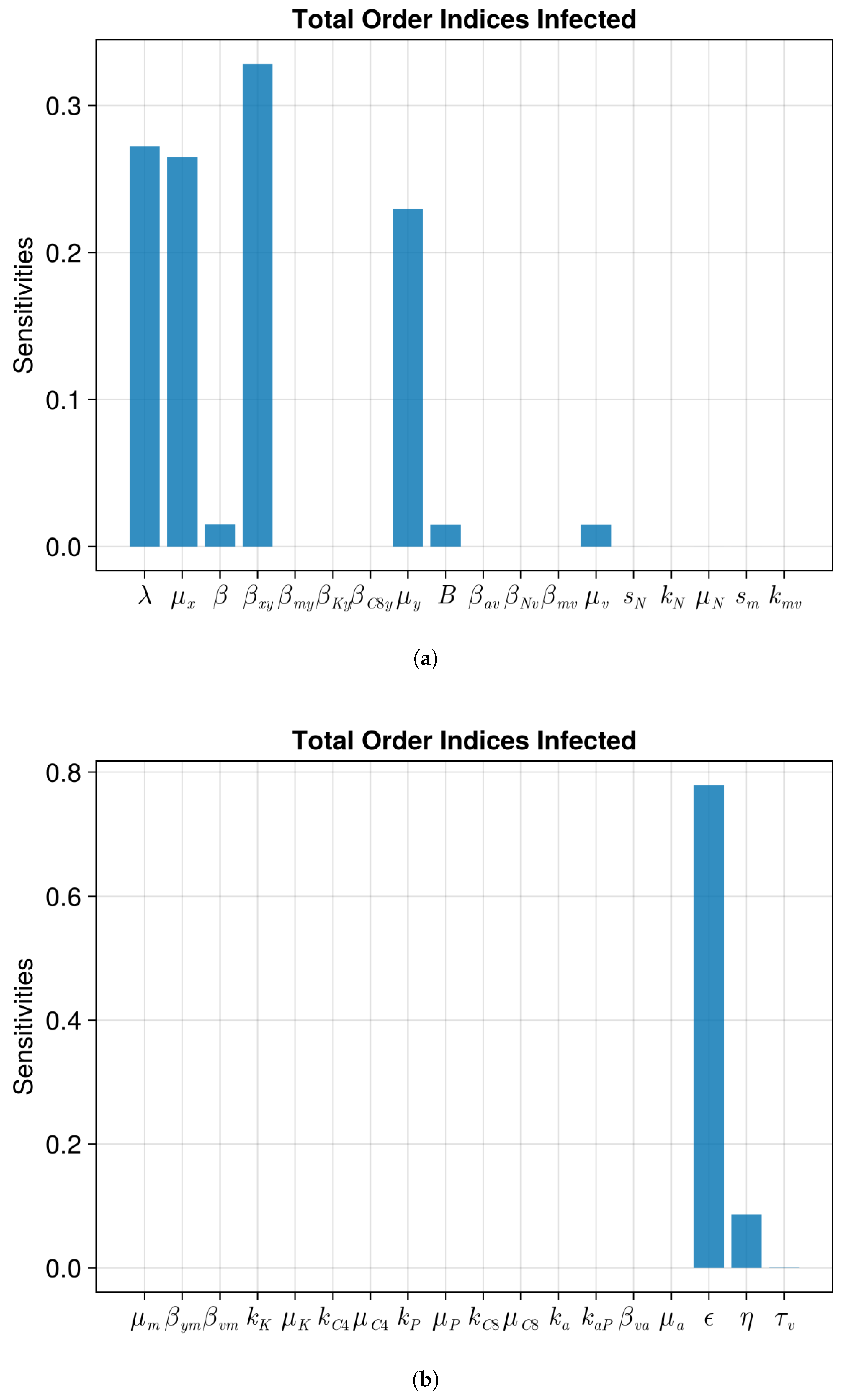 Figure 7. Sobol total order indices for the infected population of Model 1. (a) Without treatment. (b) With treatment. There is bar for each parameter of the model. The ranges of the parameters are the values from Table 1 +/− 20%.
