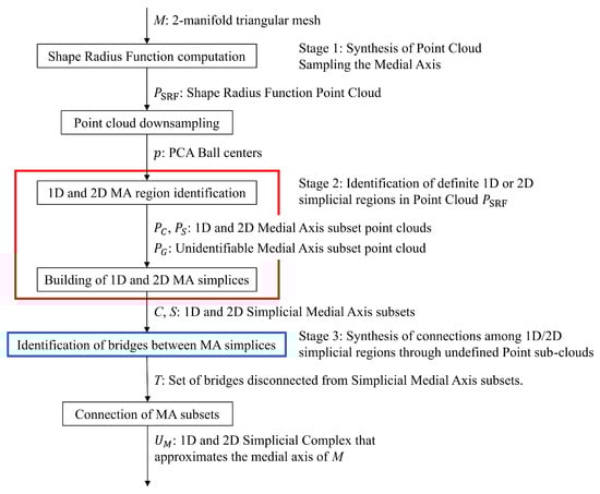 Synthesis of 1D/2D simplicial complex approximation of Medial Axis via direct palpation of SRF Point Cloud. Red and blue boxes are expanded in Algorithms 1 and 2, respectively.