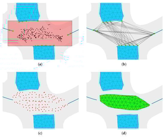Algorithm steps for junction of disconnected regions. The bridge (green) connects more than two Skeleton subsets (blue): (a) Unidentified point cloud in black. Bounding box in red, scaled by a factor . Identified points (green) inside bounding box. (b) Lines generated (black) between candidate points. (c) In red, point cloud generated by sampling the joining lines. (d) Final bridge mesh that will connect the Skeleton subsets.