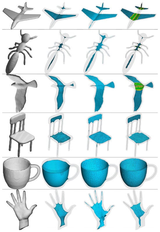 - Chen, X.; Golovinskiy, A.; Funkhouser, T. A benchmark for 3D mesh segmentation. ACM Trans. Graph. 2009, 28, 1–12. [Google Scholar] [CrossRef]
