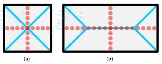 Two-dimensional illustration of the limitation of the Shape Diameter Function (SDF)-based point cloud in sampling the Medial Axis of prismatic shapes. True Medial Axis is shown in blue. is shown in red: (a) Square shape. Only one point from lies on the Medial Axis. (b) Rectangle shape. Only the central segment of the Medial Axis is sampled by .