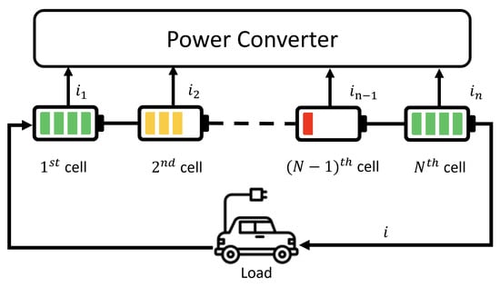The serial-connected battery considered here is shown in Figure 1, where N cells are connected to provide current i to the load, e.g., an EV. We consider the conventional hierarchical topology, namely from cells to modules and from modules to pack, as the basis for our simulations. We introduce the state-of-charge (SOC) variable for the n-th cell. Its continuous-time dynamics under balancing current (A) are