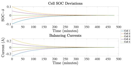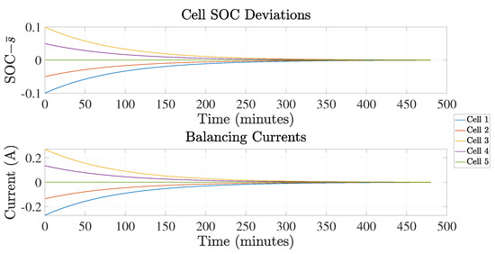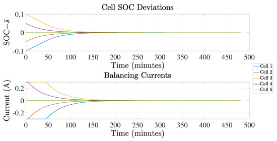 Figure 2 and Figure 3 present cell SOC deviations and balancing currents for the linear MPC controller. Specifically, Figure 2 presents results with a prediction horizon and control horizon , while Figure 3 has a prediction horizon and control horizon . As can be seen, it takes approximately 200 min to complete the battery SOC balancing. We can also observe that the system reaches balancing faster when the prediction horizon is longer. It should be noted that once the system finishes balancing, the power converter stops operating. This can also be observed from the balancing current trajectory in Figure 2, Figure 3 and Figure 4; after the cell SOCs return to 0.5, the balancing current drops to 0.