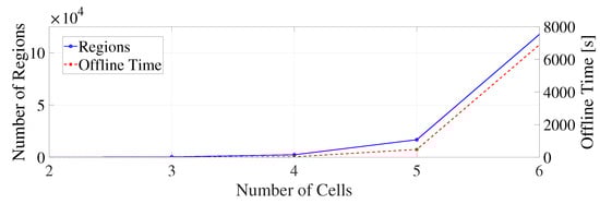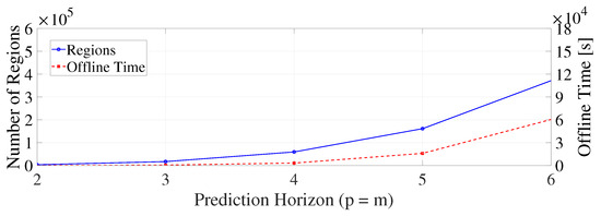 When and , the number of regions is 59,049, which is a huge computation burden. In fact, when , the complexity follows approximately , where is the state dimension, is the control input dimension, and p is the prediction horizon. In the cell balancing problem studied in this paper, , where N is the number of cells in a battery pack. Then, we have that the complexity follows approximately .