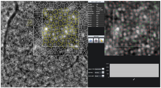 The images used in the study were captured from 120 healthy subjects with an AO rtx1 device following Helsinki declaration guidelines. The retinas of these subjects were undilated. For each subject, five regions, all with an eccentricity of × (1162 m), were captured with the centers at (0, 0), (0, −2), (0, +2), (2N, 0), and (2T, 0) producing a total of 600 images across 120 subjects. These regions have about overlap. The AO rtx1 device captured 40 images in a span of 4 s at each of these 5 regions and processed these 40 images to generate an averaged final image for each region using a cross-correlation registration method [46]. The AOdetect 3.0 image acquisition recognition software (Imagine Eyes; Orsay, Paris, France) was used to select regions of interest (ROI) within the × field of × (93 m) in each of these averaged final images and provided automatic identification of cones in this ROI.