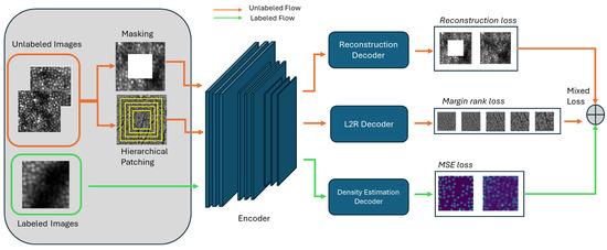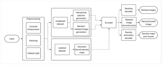 The proposed approach blends the advantages of both L2R and IP methods as a semi-supervised multi-task strategy, a hybrid of both predictive and generative pretraining techniques combined with density estimation supervision to learn features from cone images for counting. Hybrid SSL pretraining techniques have been employed in the medical domain [31,44]. While conventional semi-supervised multi-task learning typically involves multiple supervised tasks defined over labeled data, our approach introduces a novel formulation where multiple self-supervised pretext tasks are employed. The architecture is shown in Figure 3.