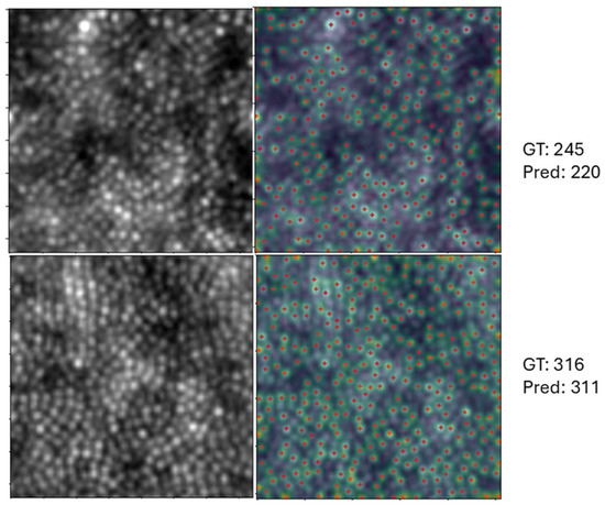 The performance of MTSSL was also assessed in different regions of the image shown in Figure 10. Since the cone distribution varies across regions, we observed that in areas blurred due to densely packed cones, the model’s performance declined. Additionally, cloudy regions and low resolution contributed to misdetections. To assess this, a 1500 × 1500 image was divided into 150 × 150 patches. Density maps were generated for each patch and then combined back to reconstruct the full-resolution image. The total counts were grouped into five percentile-based buckets: two below the average and two above, spanning the 20th, 40th, and up to the 100th percentiles. Regions with lower cone predictions are shown near the fovea or along the border regions where blurring was more prominent.