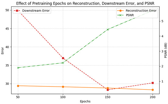 The MTSSP was performed for 150 epochs with the other parameters the same as mentioned above, and downstream for 50 epochs. The loss for MTSSP is the combination of and . However, the GAN architecture was replaced with only a reconstruction encoder–decoder instead of using a discriminator to reduce the model complexity. Hence the of was set to 0 in this case (see (3) below). The hypermeters and were set to 0.5 for a tradeoff between the tasks: