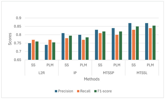 The point localization was performed on the predicted density maps. The quantitative results were evaluated using precision, recall, F1-score, and localization error of the two employed methods compared to the ground truth. While the L2R method performed better than IP in count estimation, the localization performance of the L2R-generated density maps was poor compared to IP. We observe that PLM and SS approaches showed similar scores, with SS showing slightly better scores. However, the MTSSL method produced density maps where PLM also showed better localization. The scores for different approaches are illustrated in Figure 13. The mean localization error was observed to be 2.1 for MTSSL, 2.7 for MTSSP, and 3.4 and 3.5 for IP and L2R methods. The results show that MTSSL improves the localization performance from density maps, where density maps produced by L2R show the worst F1-score localization performance.