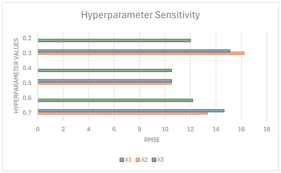 To effectively balance the individual losses within the joint optimization of MTSSL, we performed a sensitivity analysis on the lambda hyperparameters to examine how hyperparameter variations influence model performance. Specifically, we varied one hyperparameter at a time while fixing the others at their optimal values and observed the resulting changes in the model’s performance. The optimal values were determined using grid search. Figure 14 illustrates how the RMSE scores respond to these hyperparameter adjustments, highlighting the model’s sensitivity and associated uncertainty concerning each parameter. We observe that changing the hyperparameters from their optimal values affects the RMSE scores. The sensitivity arises from how each component learns features that contribute to the overall model performance. Increasing and might encourage the model to focus more on task-specific details, but this could also reduce its overall performance. Decreasing the values weakens the model’s ability to learn enough features that contribute to counting. Increasing and reducing cause density maps to merge close or noisy areas, thereby reducing the model performance. Overall, the three parameters in MTSSL can be tuned within a practical range to regulate the impact of each loss component on model performance. Systematically identifying their optimal values ensures a balanced trade-off among the inpainting, ranking, and density-estimation objectives, yielding peak performance. This sensitivity analysis guides the tailoring of MTSSL to different applications.