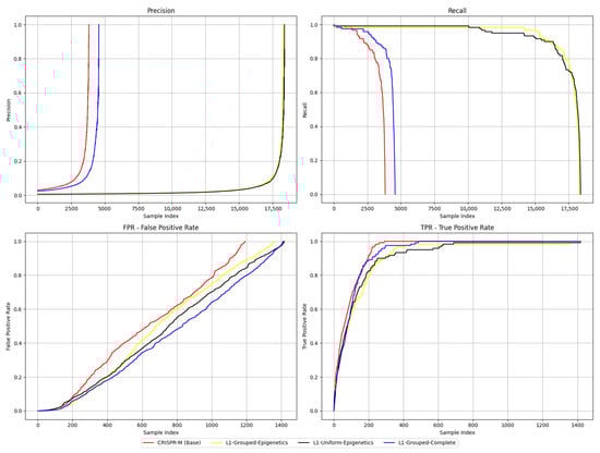 Precision and Recall curves, and the TPR and FPR curves output by the CRISPR-M evaluation framework, are shown in Figure 1. While Recall and TPR are mathematically equivalent in binary classification, both plots are included here to reflect the native output structure of the CRISPR-M evaluation framework. For clarity, they are interpreted identically in the context of this analysis. The Precision plot suggests that CRISPR-M achieved high Precision at lower thresholds compared to the other models, followed by L1-Grouped-Complete, while L1-Grouped-Epigenetics and L1-Uniform-Epigenetics reached their peaks later. In contrast, the Recall plot shows that L1-Grouped- Epigenetics and L1-Uniform-Epigenetics maintained higher Recall for longer, whereas CRISPR-M dropped off earliest. The FPR plot indicates that CRISPR-M exhibited a higher false positive rate overall, while L1-Uniform-Epigenetics and L1-Grouped-Complete maintained lower FPR values. Finally, in the TPR plot, CRISPR-M slightly outperformed the others, suggesting it identified true positives earlier.
