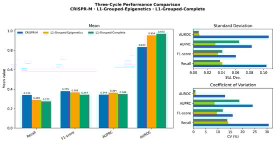 CRISPR-M, L1-Grouped-Epigenetics, and L1-Grouped-Complete were each trained in three cycles to assess stability. The results indicated that L1-Grouped-Complete achieved higher mean performance metrics than CRISPR-M, while also showing generally low variability across metrics. In particular, it achieved the lowest CV in AUROC and Recall, though variability in Precision and AUPRC was higher than that of L1-Grouped-Epigenetics. The L1-Grouped-Epigenetics variant displayed balanced performance overall, having the highest Recall, F1, and F-beta scores, though with low precision. It showed more consistent performance than CRISPR-M and L1-Grouped-Complete in most of the metrics. CRISPR-M had the lowest mean values in most metrics (AUROC, AUPRC, Recall, F1, F-beta, and Spearman correlation) and also showed the greatest variability across cycles, particularly in Recall, AUPRC, F-beta, and Spearman correlation, highlighting its sensitivity to training fluctuations.
