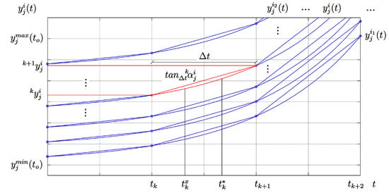 So, for the reader to understand this figure, we explain it, starting from the point . The point is an instant of the solution of the considered autonomous dynamic system. The variable j means the state variable of the considered dynamic system, where , that is, there are a total of n state variables. The variable i represents the curve of the family of curves confined in the interval and which is the solution of the considered dynamic system. By the continuum hypothesis, one can have infinite curves (). The variable k represents the k-th instant of time, that is, . In the case of the variable k, if the dynamical system solution does not come out of the region of interest [] and the system is autonomous, then the variable k can also go to infinity (). Also, when we write or it means that and .