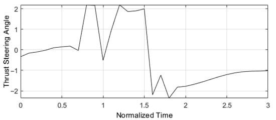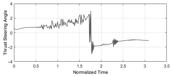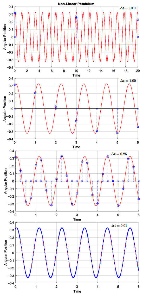However, the most interesting numerical results, concerning Example 3, are shown in Figure 12 and Figure 13. In Figure 12, the integration steps are decreased from top to bottom. Notice that when the integration step is equal to , E–TUNI could not accurately learn the angular position prediction (see all blue points in Figure 12). With the integration steps equal to or less than , E–TUNI was able to learn them perfectly. The reason for this is that multiple instances of E–TUNI training were carried out for the integration step equal to , but the best result achieved was the one presented in Table 2, that is, , confirming, again, the validity of Equation (9) as a limiting factor for this method. The E–TUNI training, which involved integration steps equal to or less than , was easily learned by the MLP neural networks in the first attempts.