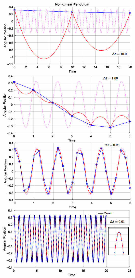 Figure 13 also presents several simulation graphs with the integration steps , used in the E–TUNI training, also decreasing from top to bottom. The dotted pink lines represent the true values of the dynamical system in question. The solid lines in blue represent the mean derivatives between two consecutive points. Continuous lines in red interpolate parabolas between two successive points. Note that, for tiny integration steps, the parabolic interpolation using mean and instantaneous derivatives functions, simultaneously, is quite accurate and relatively better than using E–TUNI alone.