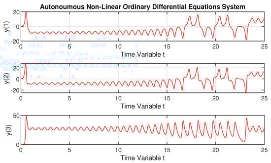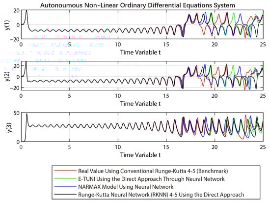 Figure 14 presents the numerical solution of the Lorenz equation using the Runge–Kutta 4-5 algorithm with the instantaneous derivative functions given by Equation (43). This solution in red is used as a benchmark. Figure 15 compares the benchmark solution with the results obtained by the NARMAX, E–TUNI, and RKNN models. Note that all the hybrid models used had difficulty learning this dynamic. However, these models showed great versatility for future improvement using deep learning neural networks. The reason why models utilizing some UNI had trouble learning this dynamic equation is explained in the following paragraphs.