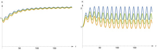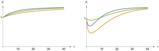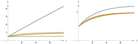 which is, therefore, the real carrying capacity of this two-parameter model. Moreover, the closer are to each other, the faster the population reaches the asymptote (8), as shown in Figure 1. Here and throughout the paper, the visualisations are performed in Mathematica, version 14 [24].