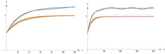 For different choices of the parameters and Figure 3 contains a comparison of the original one-parameter solution (5) with our two-parameter solutions (7) and (24), i.e., the constant and time-varying cases, respectively. The left and right figures differ only in the integration time interval: this is intentional, to highlight the behaviour at the beginning and after a sufficiently long period of integration. All solutions behave similarly, especially after an adequate time period and asymptotically. The wave-like behaviour of solution (24) is obviously due to the choice of in (23).