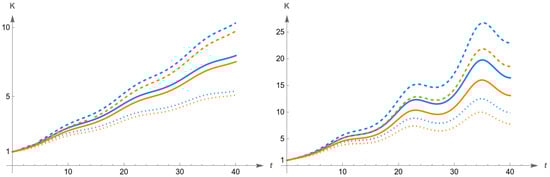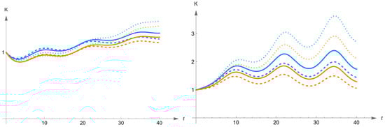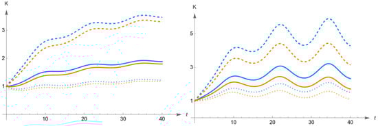 Figure 2 displays the solution (19) for different values of the case of is also taken into account; the left plots show that the solution obtained with is close but distinct from that correspondent to and the same applies to the solution obtained with The right plots show that the solutions corresponding to the parameter values and after an adequate amount of time, all tend to the same asymptotic value. In all the scenarios considered, the other constant parameters are set to the values