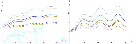 Sensitivity analysis over Three pairs of solutions [■] and [■] in (33) for 1 (dashed lines), 1.25 (solid lines), 1.5 (dotted lines). Parameters are set to (left) and to (right). All the other parameters take fixed values: