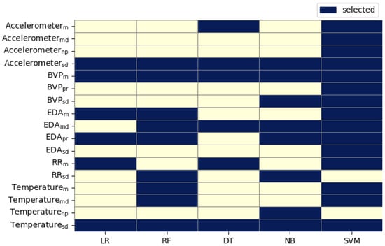 Given the variability in model performance and inherent differences in learning paradigms, model-specific feature selection and interpretation were performed. Importantly, for building sparse models, we analyzed the feature importances, coefficients, and probabilities from the 10-fold cross-validation metrics and chose top-k, where k was the minimal number of features per model, as shown in Figure 4; thus, when used on a hold-out test set, it gave the best performance when compared with the base models using full feature set on a single train-test split setting, shown in Table 8. This individual top-k features per model approach avoids the risk of overinterpreting features from underperforming models and provides a more grounded understanding of physiological drivers for each classifier. Furthermore, any convergent features across models were noted as candidates for robust domain-level significance, for future investigation.