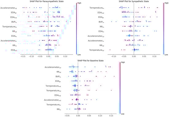 SHAP values illustrating the impact of each feature on the model’s output across the three physiological states: parasympathetic, sympathetic, and baseline. (feature notation is same as in Figure 4).