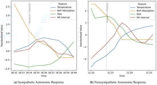 For instance, an increase in the magnitude of the RR interval from baseline to the postural phase is indicative of parasympathetic activity, aligning with previous findings that associate elevated RR intervals with higher vagal tone [], can be observed in Figure 6. Skin temperature tends to rise under parasympathetic dominance due to a reduction in sympathetic vasoconstriction, reflecting increased peripheral blood flow. In contrast, EDA typically decreases as parasympathetic activity prevails. However, it is important to note that during the initial phase of posture execution, a brief surge in EDA may occur triggered by transient sympathetic arousal in response to physical effort before it subsides as the parasympathetic state establishes itself. BVP, reflecting peripheral vascular tone, also increases under parasympathetic influence, signifying vasodilation.