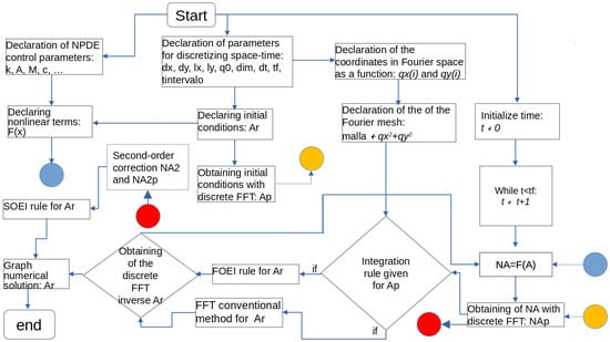 The Equations (4), (6), (7), and (9) were solved with the algorithm present in Figure 1, whose pseudo-code is shown in Algorithm 1. In this case, the programming language used takes on importance because it is an intermediate language, which allows for better use of the RAM memory of the computer equipment used to implement a specific numerical method. Furthermore, it is well known that the numerical methods implemented in our research are more efficient than finite difference methods. This implies that the combination of the algorithm and intermediate programming language has a computational efficiency greater than or equal to that of high-level programming languages.