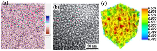 where q is a mode in Fourier space. The parameters used were obtained from the literature [], and others were modified. In Appendix A, Table A1, each of them is shown. Section 4.1 presents the source code that solves the Cahn–Hilliard phase-field equation with the FFT method following the algorithm in ref. [] to understand the nature of the evolution of the microstructure due to the substitution of Ga in the amorphous alloy Ce75Al25 − xGax. The 2D simulation is used with the Python 3.9.1 program (and libraries: NumPy, math, Tkinter) [,,,,].