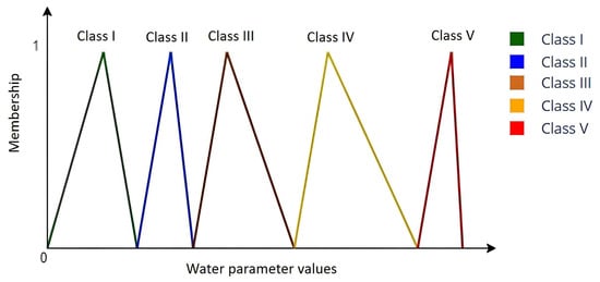 Figure 3 provide an intuitive yet mathematically grounded framework that enables gradual transitions between classes. This approach aligns with fuzzy logic theory, where intermediate parameter values contribute simultaneously to multiple quality categories, offering a realistic and interpretable basis for water quality classification. Beyond visualization, these triangular membership functions also provide analytical value by modeling the gradual transition between adjacent classes, thus capturing uncertainty and soft boundaries in water quality classification. This ensures that parameter values near thresholds are not rigidly categorized but instead represented in a way that supports more accurate interpretation and decision-making.