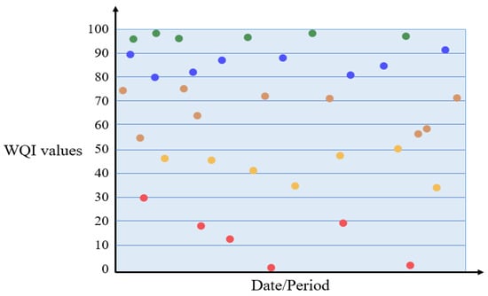 Figure 5. The map accurately depicts water quality over time by designating a distinct color to each data point according to WQI categories. This facilitates straightforward interpretation of environmental conditions through immediate visual indicators. The graph features a clearly labelled